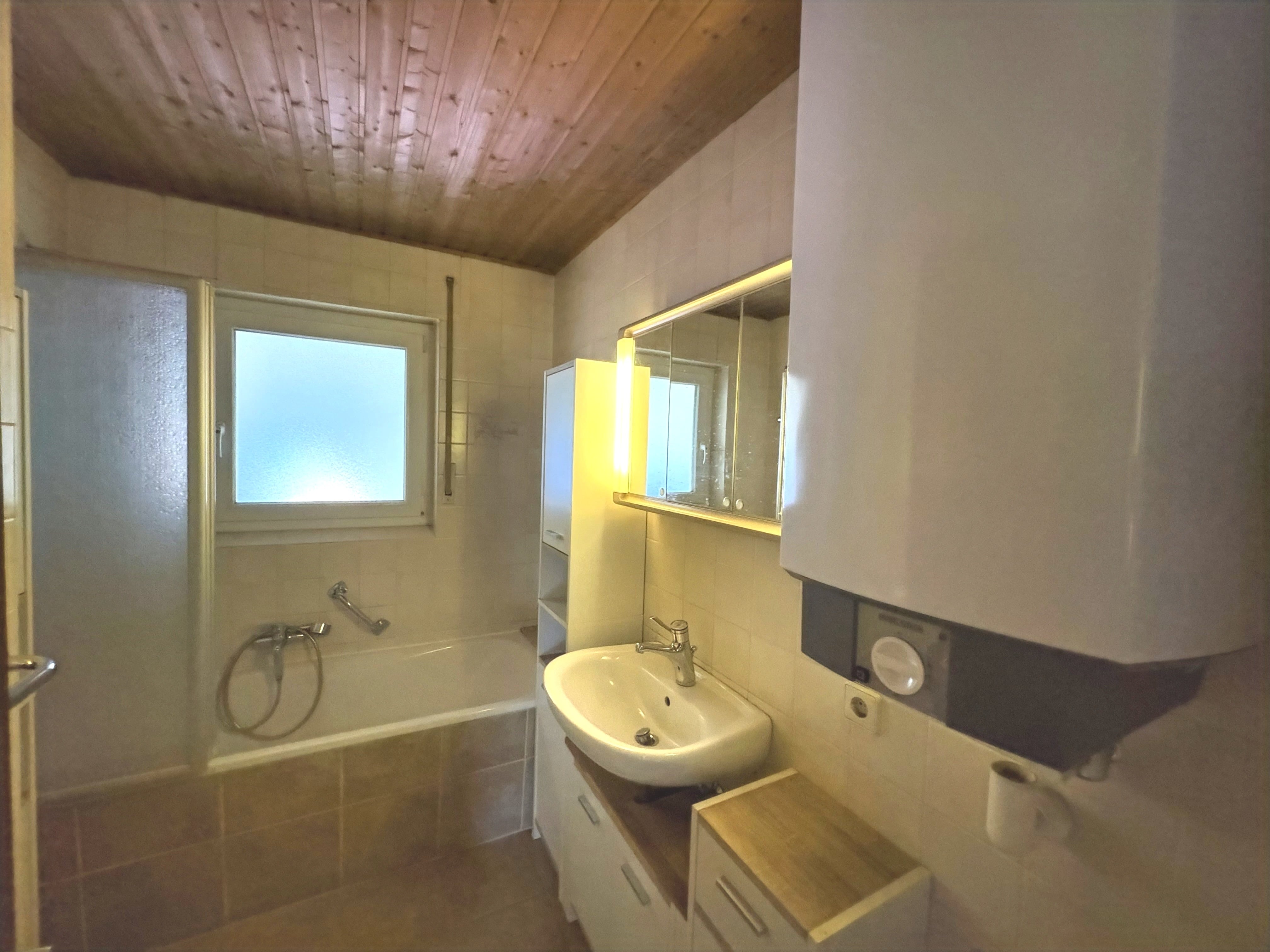 Das Erdgeschoss bietet eine Wohnfläche von ca. 105 m² mit zwei Zimmern, einem großzügigen Wohnzimmer mit Zugang zum Balkon und schönem Ausblick, einer geräumigen Küche sowie einem Badezimmer mit Fenster und separatem WC. Die Fenster wurden 2020 erneuert und sind als 3-fach verglaste Kunststofffenster ausgeführt.