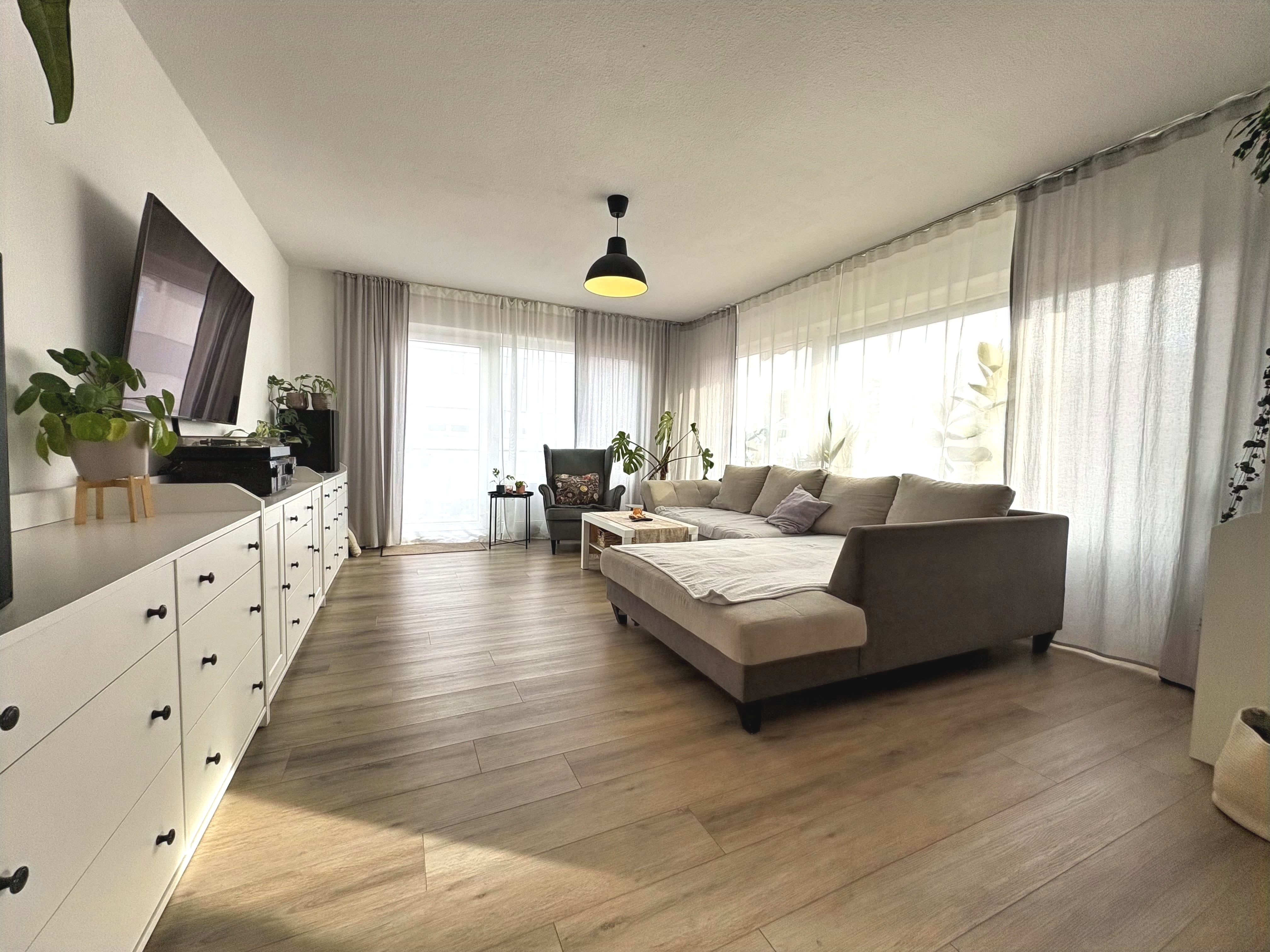 Das Herzstück der Wohnung ist das lichtdurchflutete Wohnzimmer, das dank großer Fensterflächen eine freundliche und einladende Wohnatmosphäre schafft. Hier lassen sich Wohnen und Essen harmonisch miteinander verbinden.
