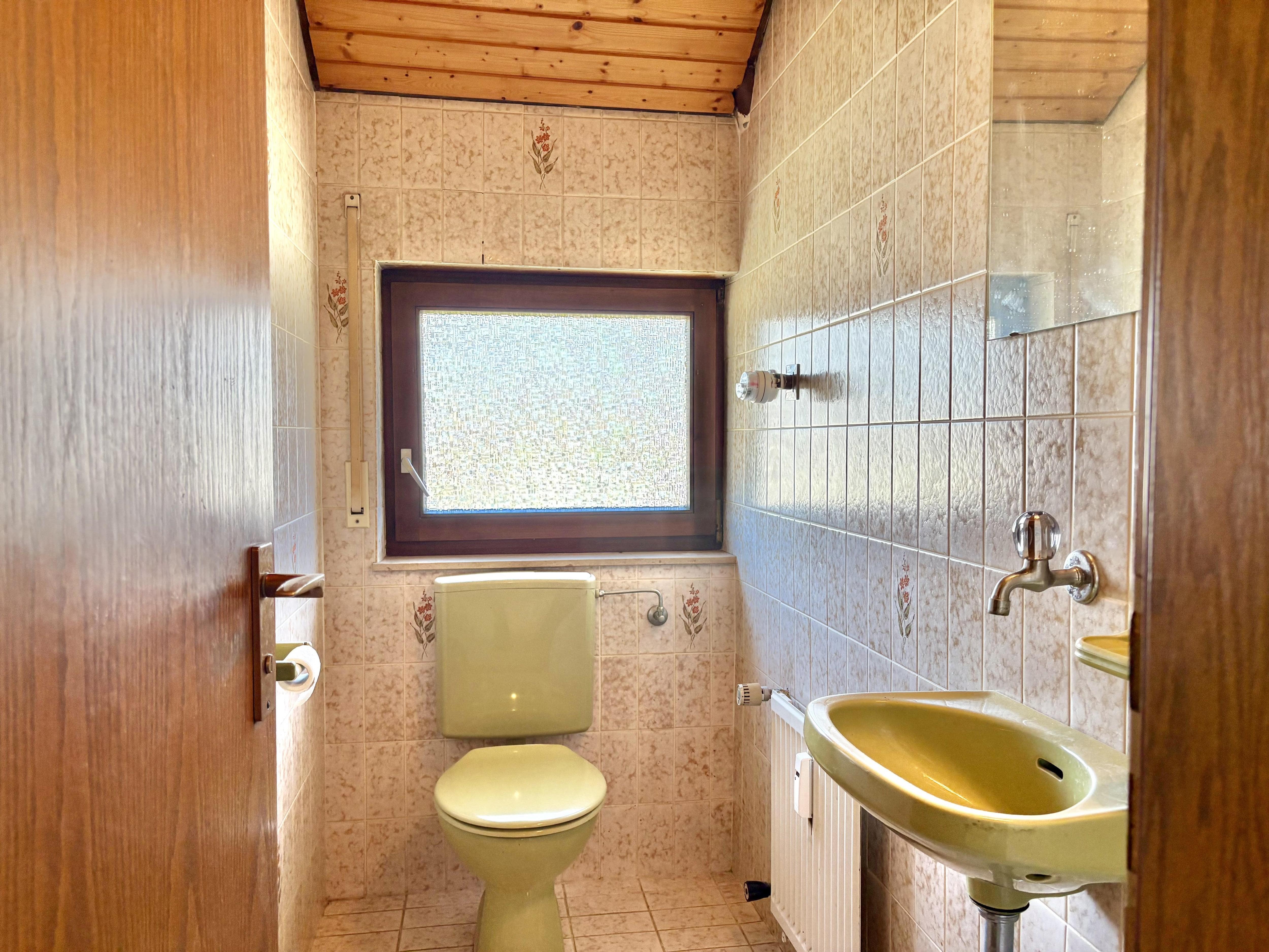 Wände: Tapete, Fliesen.